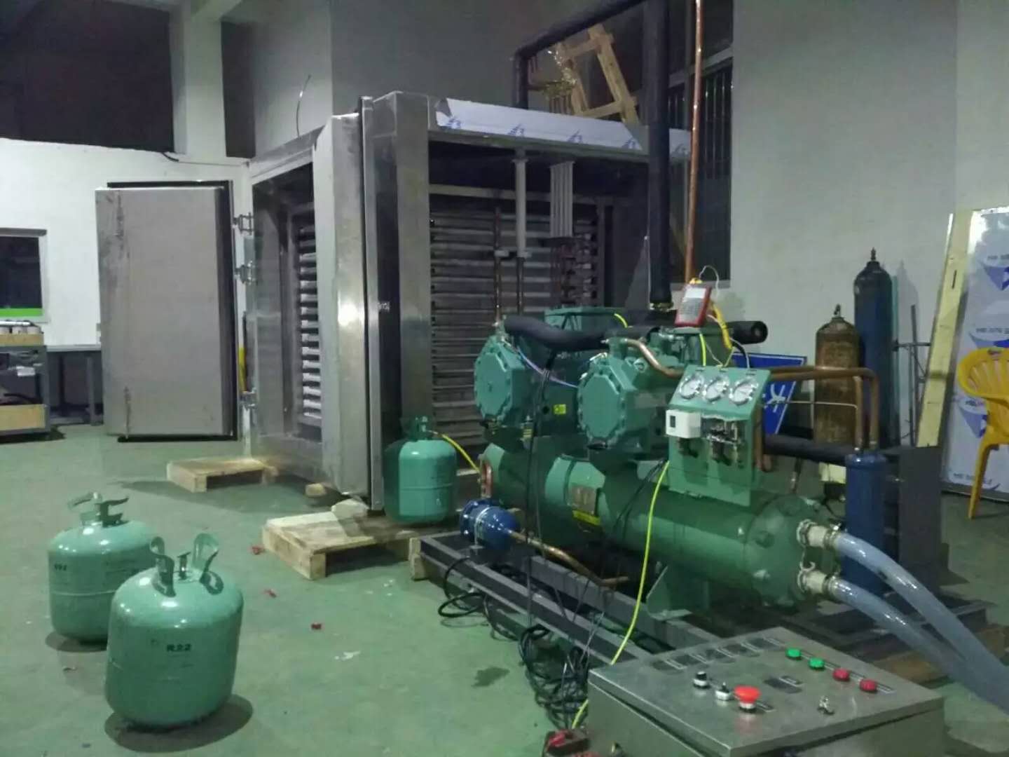 冷庫工程名稱: 一體化速凍冷庫 冷庫設(shè)計要求: 速凍量:1000KG/8小時;速凍溫度:-35度至-40度 機組品牌及匹數(shù): 北京比澤爾、30HP 庫內(nèi)蒸發(fā)器: 擱架式速凍鋁平板 應(yīng)用范圍: 海鮮加工,食品廠速凍等行業(yè)